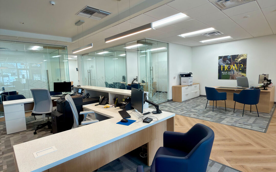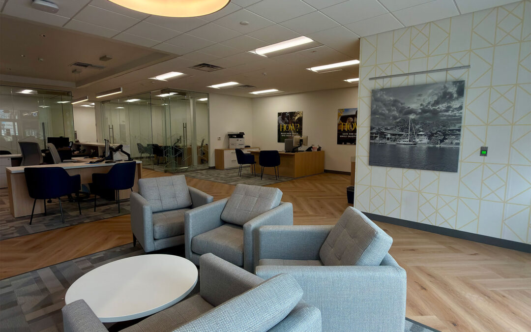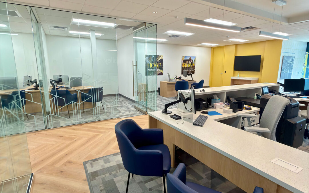 The Valley Bank project, located in Melbourne, Florida, consisted of a complete interior renovation of an existing business occupancy space. The scope of work included the construction of new interior glass office partitions, custom architectural millwork, glass storefront systems, specialty ceilings, and high-end finishes—including herringbone-patterned flooring throughout key public areas.